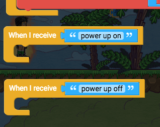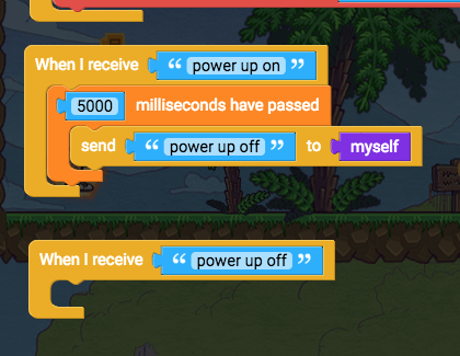 When “power up on” is received, in 5000 milliseconds we will send myself “power up off” so that the power up effect only lasts 5 seconds.
