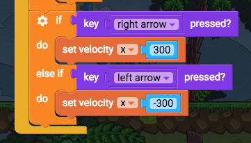 Add these blocks to the constantly block: If key right arrow pressed, set velocity x 300, else if key left arrow pressed, set velocity x -300