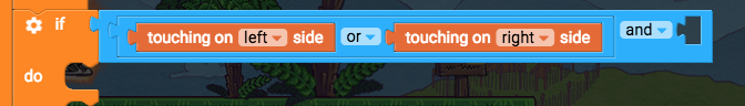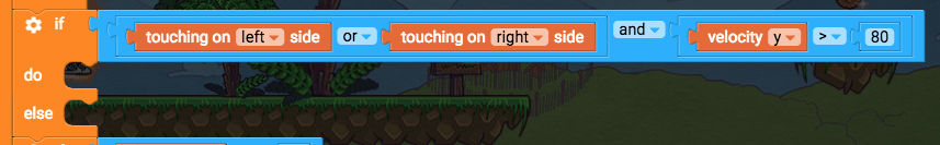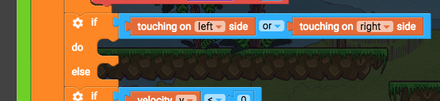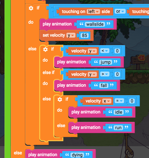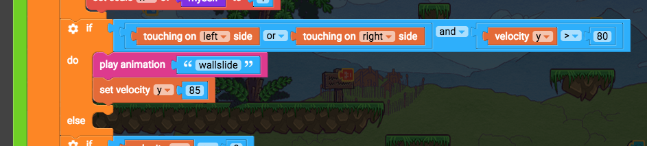 Find the “play correct animations” function Before we check if the player should be jumping or falling or running or dying, we’ll check if they should be sliding on a wall. So we’ll say “if I should be wall sliding, then wallslide, or else do the other animations”. If touching on left side or touching on right side, and velocity y > 80, play animation wallslide, else … Inside the “play correct animations function, above the if velocity y < 0 blocks, add these blocks: If do (control flow) Change if do to if-else