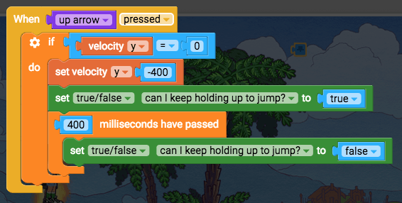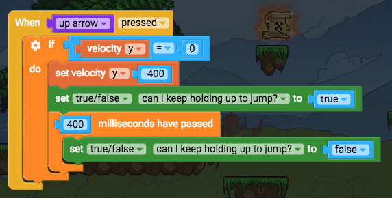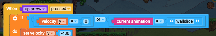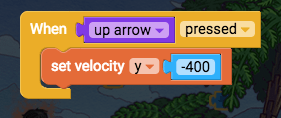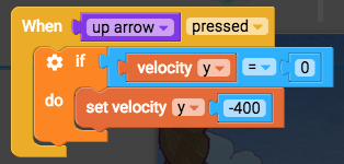- Edit player controls, find your jump blocks “when up arrow pressed, set velocity y -400”