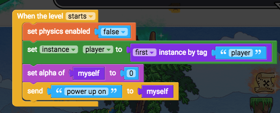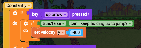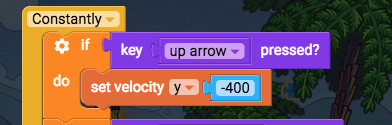 Now have the player constantly jump upwards if the up arrow is pressed. Add this to your existing constantly block: “if up arrow pressed, set velocity y -400”