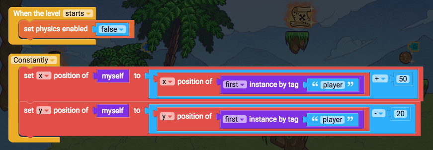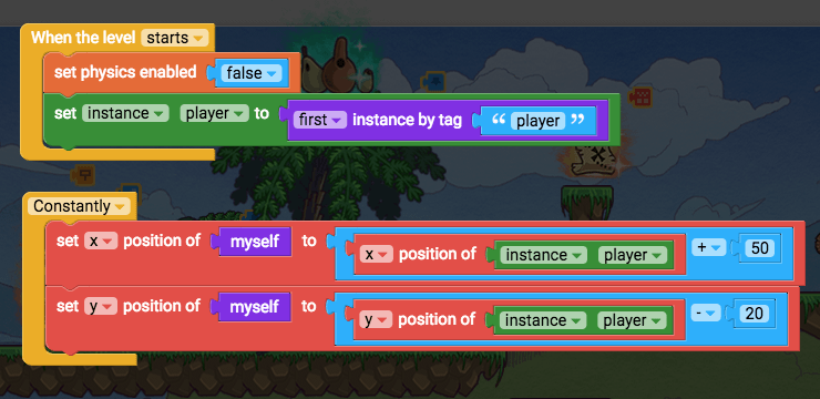 There’s a performance problem with using “first instance by tag” inside the constantly loop. Since we are running that block constantly to try to find the player, the game is searching through every single object in the game just to find the player. This can start to slow the game down.