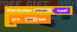 > Open Events, and drag "When the player presses myself" into the work space. > Open Control Flow and drag "go to next level" into the "When the player presses myself" block.