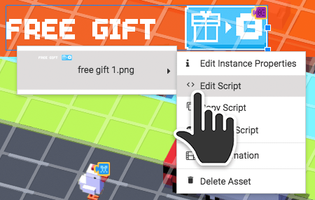 > Click Close to close the game preview. > Right-click on the Free Gift button and select Edit Script.