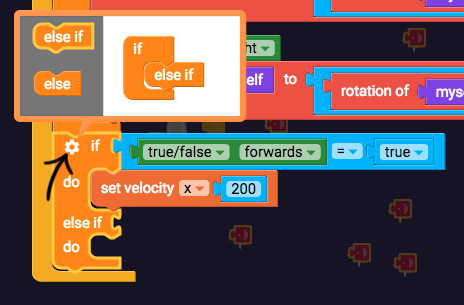 Grab the "if" block (from Control Flow), two "_=_" blocks, (from Operators), the "true" block and the "false" block (from Operators), and two "set velocity x" blocks (from Physics). Once you've dragged those blocks out into the Constantly block, click on the cog icon on the "if" block and drag the "else if" block inside the "if" block. This will make the "if" block into an "if, else if" block, which allows you to specify alternative things that should happen if the condition is different.