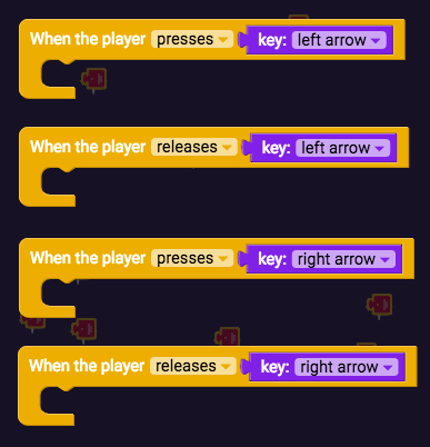 Edit the script on the player object. We'll use boolean (true/false) variables for setting the left and right rotation on and off, and we'll toggle those variables when the left and right arrow keys are pressed and released. Grab the event blocks for pressing and releasing both the left and right arrow keys (From Events).