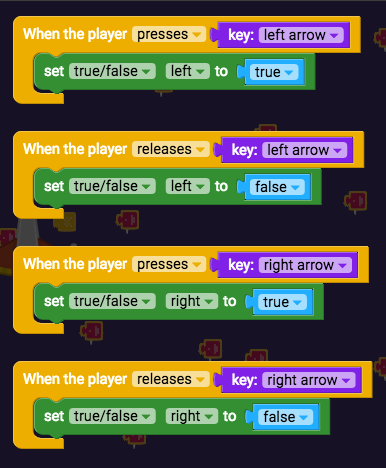 Then create two true/false property variables for "left" and "right" (from Variables), and set them to true when their key is pressed, and false when it's released.