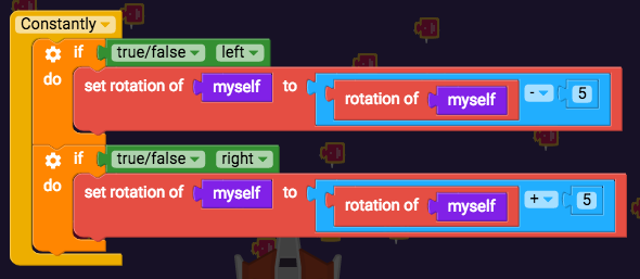 Now we'll use the Constantly event block to detect if those variables are true, and if they are, it will make the rotation decrease by 5 when turning left, and make the rotation increase by 5 when turning right.