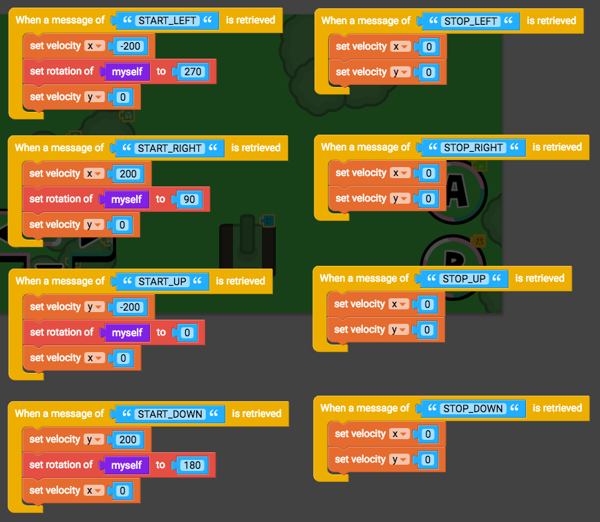 START_DOWN START_LEFT START_RIGHT START_UP (this one is sent from the d-pad's up button and the A button) STOP_DOWN STOP_LEFT STOP_RIGHT STOP_UP (this one is sent from the d-pad's up button and the A button) START_ACTION (this one is from the B button) STOP_ACTION (this one is from the B button) Here's an example of a script BEFORE the proper blocks have been added: