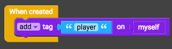 Edit the script on the game object you wish to be controlled by the d-pad. First, we need to make sure the game object will be recognized as the player. Grab the "add tag tag name on myself" block (from Sensing) and drag into a "When created" block. Change the tag name to "player".