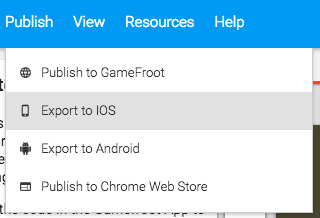 When you want to take your game and get it on the App Store or Play Store, you'll need to export your game files and download them to your computer (you need a Pro account to do this). Click on the Publish menu, and select Export to iOS or Export to Android.