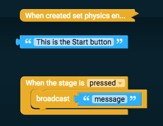 This will detect when the stage is pressed and run any block we put inside it. We'll now broadcast a message to the game to tell it to start. Open Events again, and drag "broadcast message" into "When the stage is pressed".