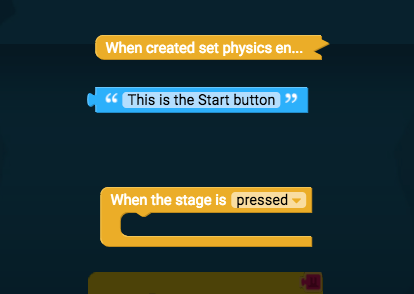The button needs to be coded to make the game start when the game is clicked on. To find the first block we need, open Events and drag "When the stage is pressed" into the work space.