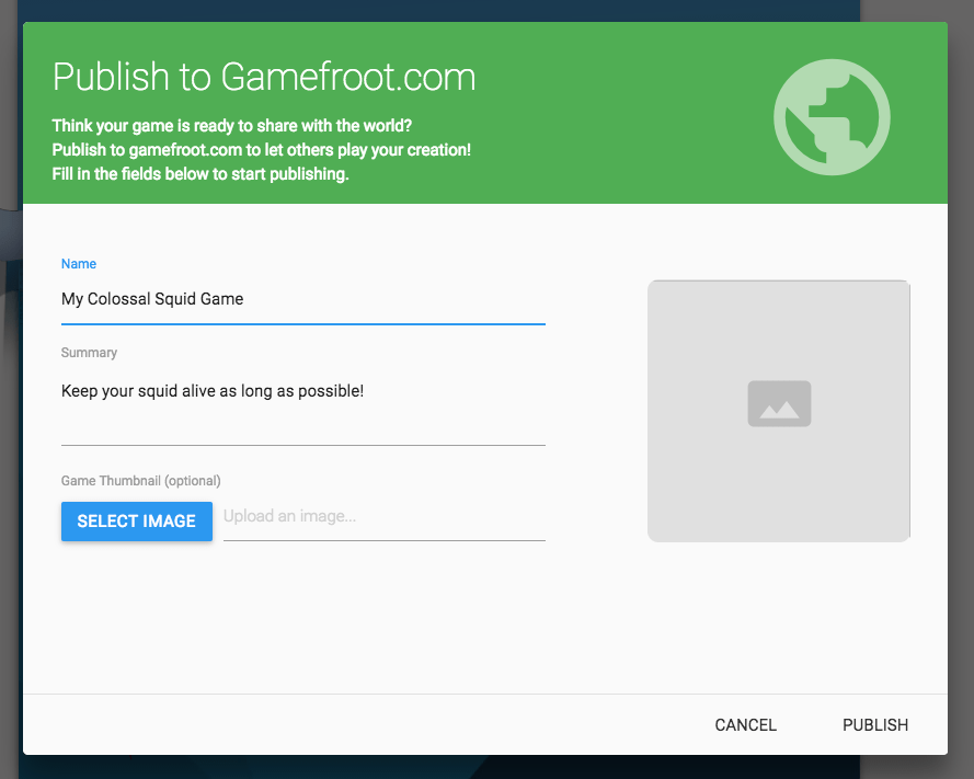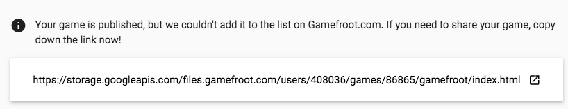 Then click PUBLISH in the bottom-right corner of this window. After the game has published, you will see a link appear for your game which looks like this: